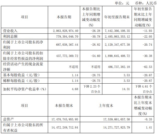 片仔癀第三季度营业收入为20.64亿元,同比下降26.28%,归属于上市公司股东的净利润为6.87亿元,同比下降28.82%。年初至报告期末,公司营业收入为74.42亿元,同比下降11.93%,归属于上市公司股东的净利润为21.29亿元,同比下降20.74%。