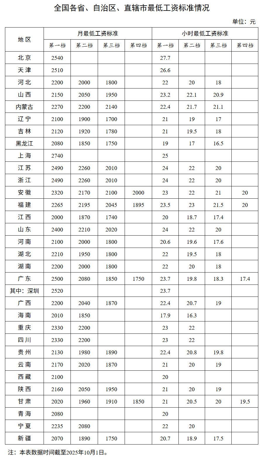 【大河财立方消息】10月19日消息,人力资源和社会保障部近日公布全国各省、自治区、直辖市最低工资标准情况(截至2025年10月1日)。