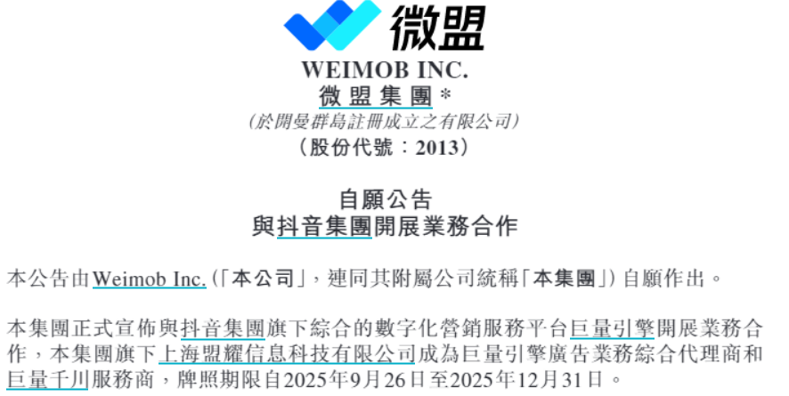 【大河财立方消息】10月20日,微盟集团发布公告称,与抖音集团旗下综合的数字化营销服务平台巨量引擎开展业务合作,集团旗下上海盟耀信息科技有限公司成为巨量引擎广告业务综合代理商和巨量千川服务商,牌照期限自2025年9月26日至2025年12月31日。