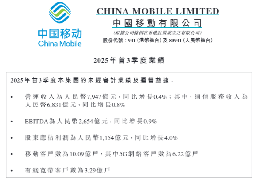 截至2025年9月30日,中国移动移动客户总数达到10.09亿户,其中5G网络客户数达到6.22亿户;有线宽带客户总数达到3.29亿户,首3季度净增1420万户;家庭宽带客户达到2.88亿户,前三季度净增976万户。