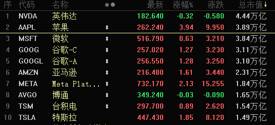 【大河财立方消息】10月21日消息,苹果股价大涨3.94%,报收262.24美元/股,创历史新高;总市值达3.89万亿美元,超越微软成为美国第二大市值公司,仅次于英伟达(4.44万亿美元)。