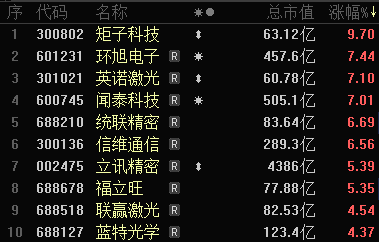 A股苹果概念股中,矩子科技上涨9.7%、环旭电子上涨7.44%、英诺激光上涨7.10%。