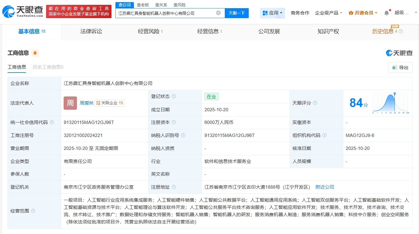 【大河财立方消息】天眼查工商信息显示,10月20日,江苏鼎汇具身智能机器人创新中心有限公司成立,法定代表人为周爱林,注册资本6000万人民币,经营范围包括人工智能行业应用系统集成服务、人工智能硬件销售、人工智能公共数据平台、人工智能通用应用系统等。