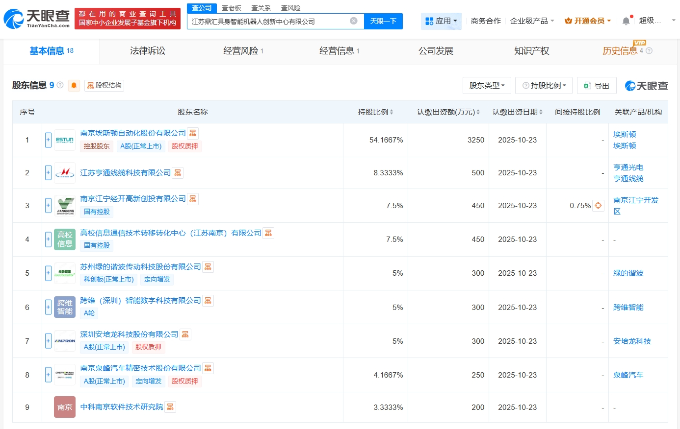 股东信息显示,该公司由埃斯顿、江苏亨通线缆科技有限公司、绿的谐波、安培龙、泉峰汽车等共同持股。
