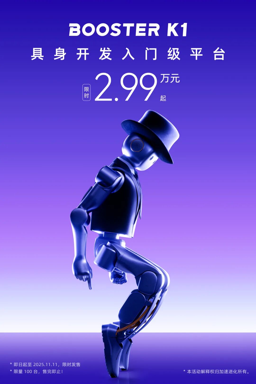 【大河财立方消息】10月21日,加速进化宣布将发布Booster K1 新机器人。据悉,该产品为具身开发入门级平台, 限时2.99万起,支持二次开发,身高1m,体重19kg,主要面向教育、赛事、展演等场景。