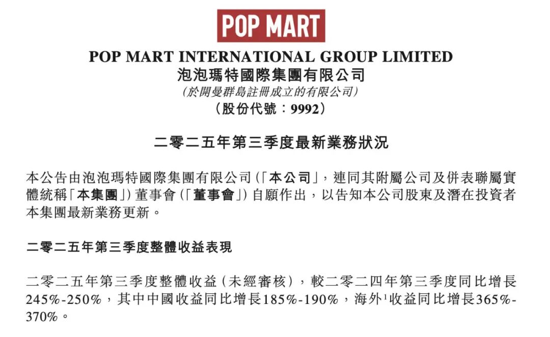 【大河财立方 记者 王宁宁】10月21日下午,泡泡玛特公告2025年第三季度最新业务情况。公告显示,2025年第三季度,泡泡玛特整体收益同比增长245%~250%,其中中国市场收益同比增长185%~190%,海外市场收益同比增长365%~370%。