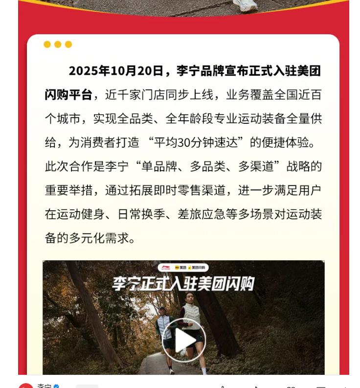 10月20日,李宁品牌宣布正式入驻美团闪购平台,近千家门店同步上线,实现全品类、全年龄段专业运动装备全量供给,为消费者打造“平均30分钟速达”的便捷体验。李宁表示,此次合作是其“单品牌、多品类、多渠道”战略的重要举措,通过拓展即时零售渠道,进一步满足用户在运动健身、日常换季、差旅应急等多场景对运动装备的多元化需求。