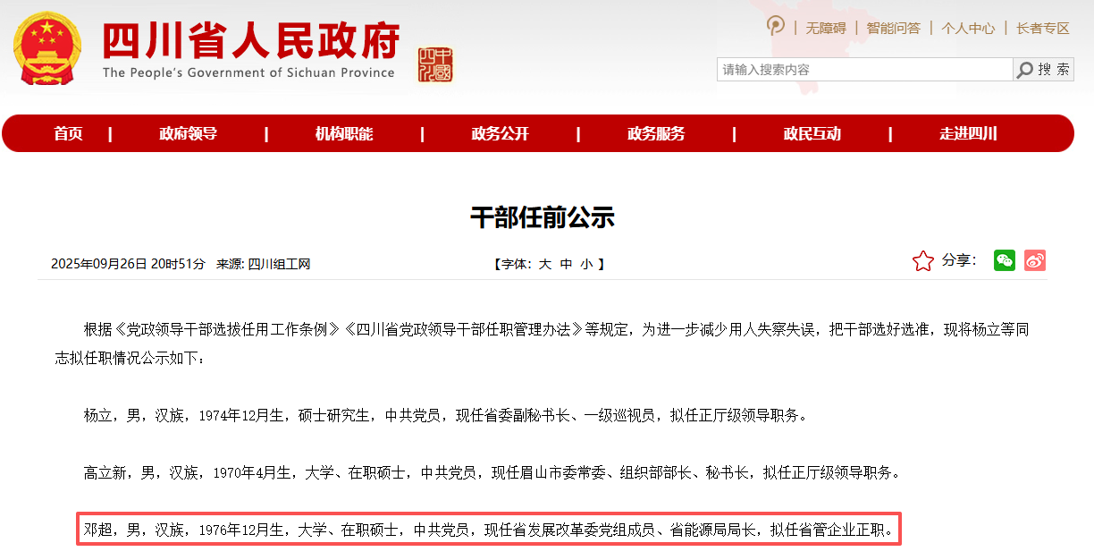而邓超的接任也早已有迹可循。9月26日,中共四川省委组织部发布的干部任前公示显示,四川省发展改革委党组成员、省能源局局长邓超,拟任省管企业正职。