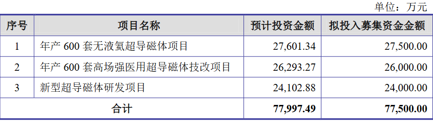 健信超导本次拟公开发行股票不超过4192万股(不含采用超额配售选择权发行的股票数量),不低于发行后总股本的25%,拟募资7.75亿元,募集资金将投资于年产600套无液氦超导磁体项目、年产600套高场强医用超导磁体技改项目、新型超导磁体研发项目。