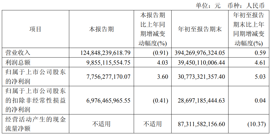 【大河财立方消息】10月21日,中国电信披露2025年第三季度报告。前三季度,中国电信实现营业收入3942.7亿元,同比增长0.59%;归母净利润307.73亿元,同比增长5.03%。其中,第三季度实现营业收入1248.48亿元,同比下降0.91%;归母净利润77.56亿元,同比增长3.6%。