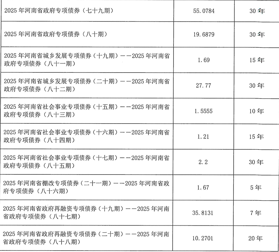 【大河财立方消息】10月21日,河南省财政厅公告,拟发行2025年河南省政府一般债券(十一至十二期)、专项债券(七十九至八十七期)、再融资专项债券(二十期),规模合计377.9686亿元。其中,2025年河南省政府再融资专项债券(二十期)规模10.2701亿元,用于置换存量隐性债务。