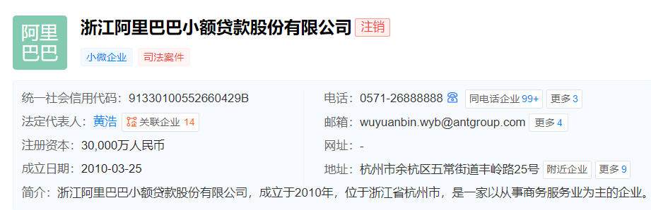 【大河财立方消息】10月22日,天眼查信息显示,浙江阿里巴巴小额贷款股份有限公司已于2025年10月17日被注销。