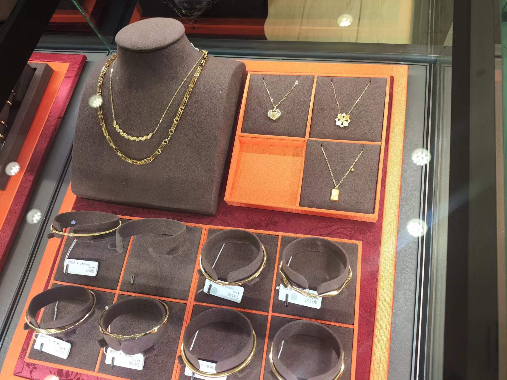 郑州郑东新区丹尼斯百货商场内,周生生金店的今日金价牌子显示,足金为1238元/克,较昨日的1289元/克跌了51元/克。中国黄金金店的今日金价牌子显示,足金为1228元/克,较昨日的1285元/克跌了57元/克。