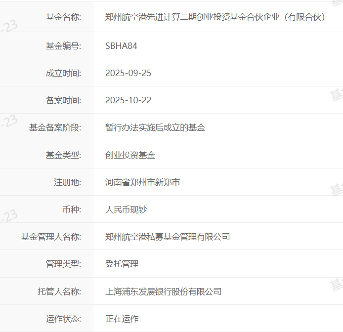 【大河财立方消息】10月23日消息,郑州航空港先进计算二期创业投资基金合伙企业(有限合伙)在中基协备案。