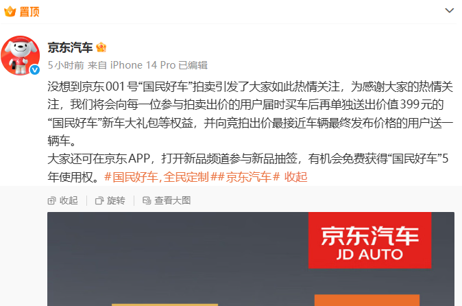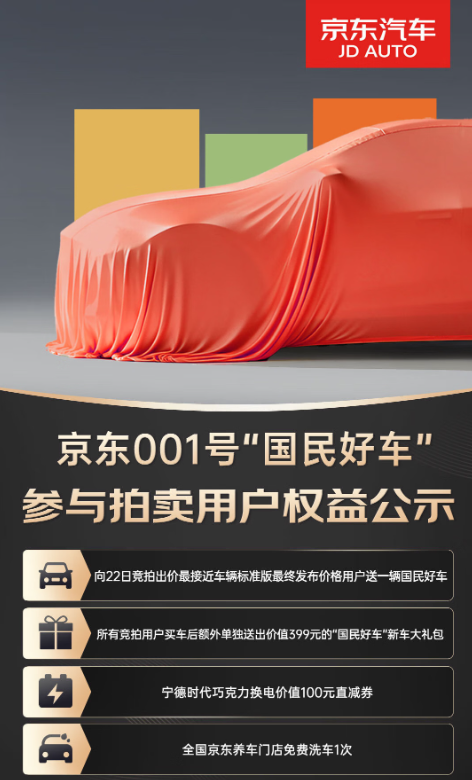 京东汽车官微回应,为感谢大家的热情关注,“将会向每一位参与拍卖出价的用户届时买车后再单独送出价值399元的‘国民好车’新车大礼包等权益,并向竞拍出价最接近车辆最终发布价格的用户送一辆车”。用户还可在京东App,打开新品频道参与新品抽签,有机会免费获得“国民好车”5年使用权。
