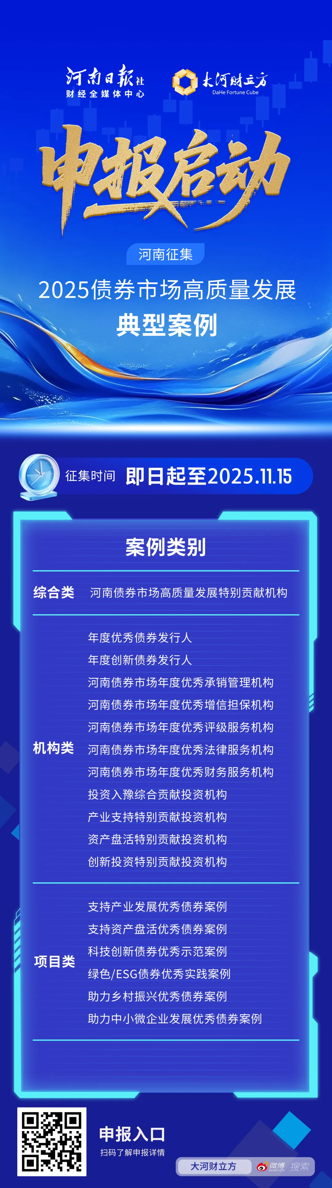 【大河财立方 记者 陈玉静】涵盖服务科技创新、支持绿色发展、助力乡村振兴......2025债券市场高质量发展典型案例征集活动自10月13日启动以来,参与、服务、投资河南省债券的各类市场主体,正踊跃申报。