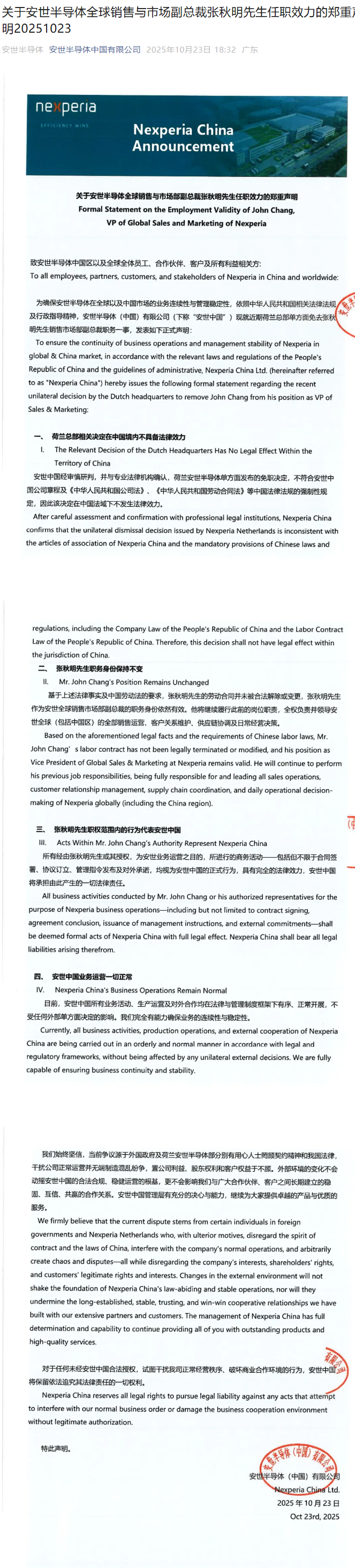 【大河财立方消息】10月23日,安世半导体中国有限公司公众号发布关于安世半导体全球销售与市场副总裁张秋明先生任职效力的郑重声明。