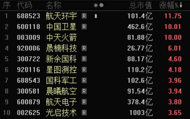 截至发稿,航天航空板块整体涨幅2.28%。板块内46只个股中,42只个股飘红。中国卫星、中天火箭涨停,航天环宇一度20CM涨停,截至发稿涨幅回落至11.75%。