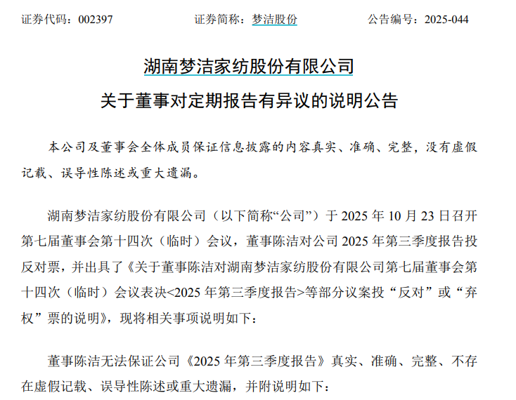 不过,梦洁股份董事陈洁对2025年第三季度报告投出了反对票。