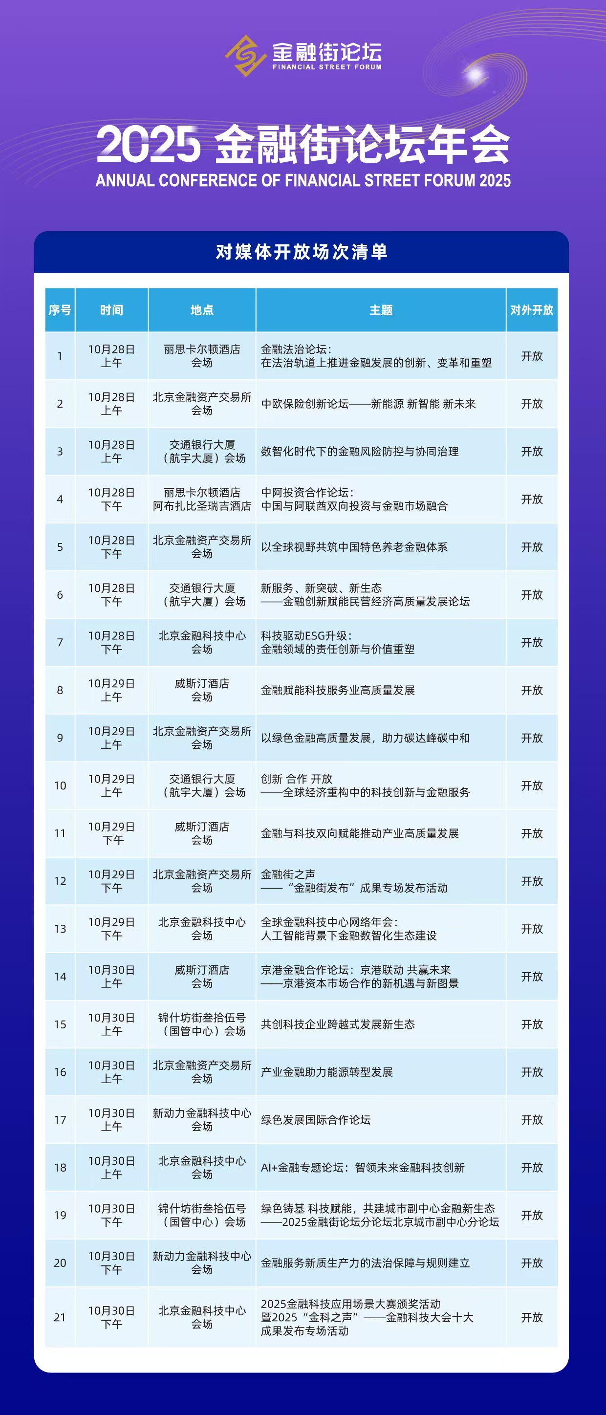 一是国家重要金融政策发布。2025金融街论坛年会是党的二十届四中全会后,经济金融领域首次举办的国家级、国际性论坛。年会将深入学习贯彻全会精神,围绕“十五五”金融改革发展方向、进一步做好金融“五篇大文章”,北京市委主要负责同志将出席论坛并致辞,国家金融管理部门主要负责同志将在开幕式上做主题演讲,届时系列金融政策将在年会期间发布。
