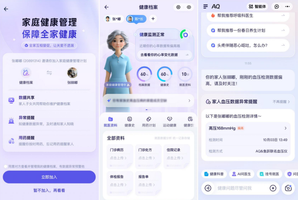 为帮助解决这些问题,围绕老年慢病健康管理,AQ推出了多项功能:拍一拍血压计、血糖仪即可智能解读数据,像医生能追问,并支持健康数据异常的即时预警;与鱼跃联合推出AI血压计,可自动同步数据并生成健康周报,便于血压长期管控;推出慢病用药提醒功能,父母和子女都会定时收到通知,减少忘吃漏吃,避免病情反复;支持健康档案共享给家人,父母的病历和体检报告,子女随时能看、能管、能提醒。通过技术让子女即使身处异地,也能为父母的健康筑起“防护网”,让重阳节的关怀不止于节日,更融入日常慢病管理的每一个细节。
