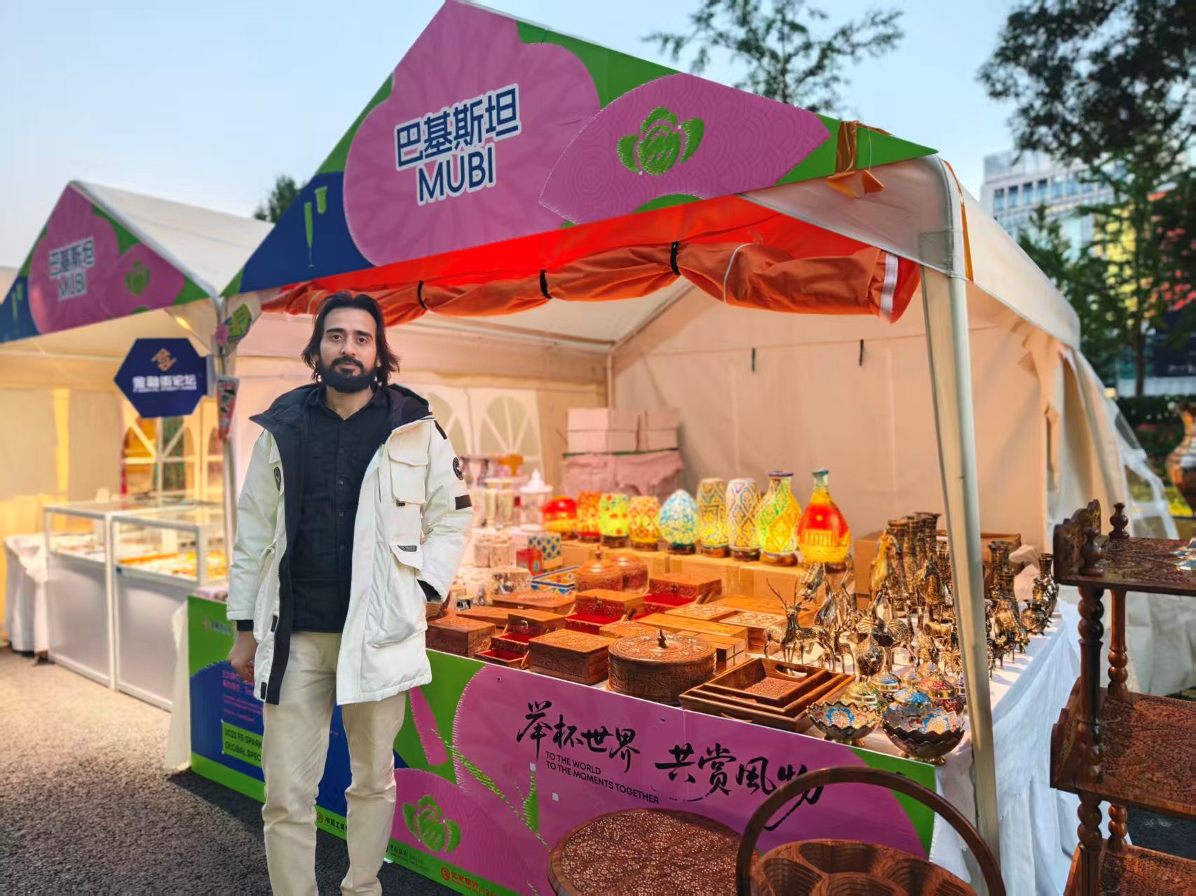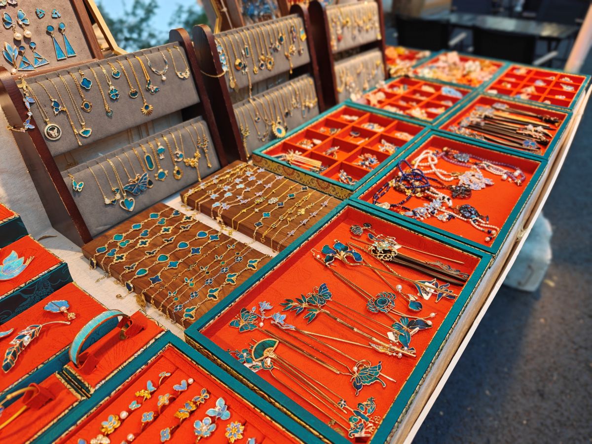 另一个摊位上,手工制作的饰品琳琅满目,有巴基斯坦的精美摆件,也有拉脱维亚的琥珀项链,每一件都蕴含着独特的异域风情。还有来自中国的非遗绒花、非遗点翠等传统手工艺品,它们与国外的手工艺品相互映衬,共同营造出浓厚的多元文化氛围。