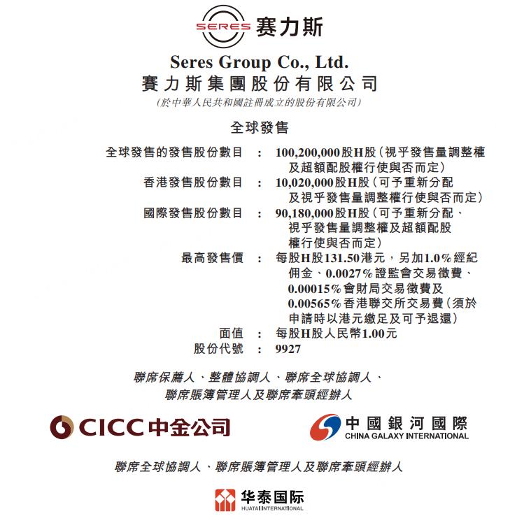 今年4月28日,赛力斯向港交所递交上市申请,10月13日通过聆讯,10月27日启动国际配售和香港公开发售。赛力斯本次H股的基础发行规模达1.002亿股,其中香港公开发售1002万股H股,国际发售约9018万股H股。其招股书披露,赛力斯本次发行吸引了超过22家基石投资者,其中包括重庆产业母基金、林园基金、广发基金、施罗德、中邮理财、星宇香港等。