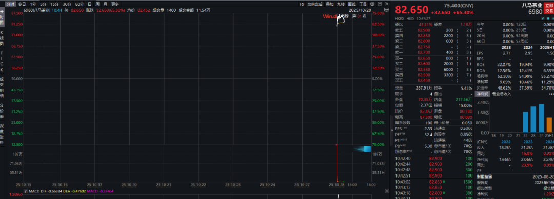 【大河财立方 记者 司高妍 郝楠楠 文图】10月28日,八马茶业(6980.HK)在港交所敲锣上市,“高端中国茶第一股”宣告诞生。上市当日,该股盘中大涨超过70%,截至10:44发稿,每股报82.65港元,涨幅65.30%。