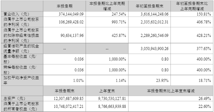 数据显示,光线传媒第三季度实现营收3.74亿元,同比增长247.54%;净利润为1.06亿元,同比增长993.71%。前三季度营收为36.16亿元,同比增长150.81%;净利润为23.36亿元,同比增长406.78%。