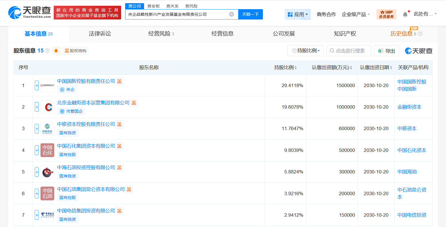 在此之前,今年10月,央企战新产业发展私募基金管理有限公司也已成立,注册资本1亿元。经营范围包含:私募股权投资基金管理、创业投资基金管理服务。出资股东包括中国国新、中国移动以及中国石油、中国石化和中国海油五家央企各自的资本投资平台。