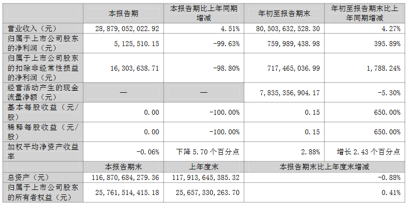 报告显示,新希望第三季度实现营业收入288.79亿元,同比增长4.51%;归属于上市公司股东的净利润为512.55万元,同比下降99.63%。