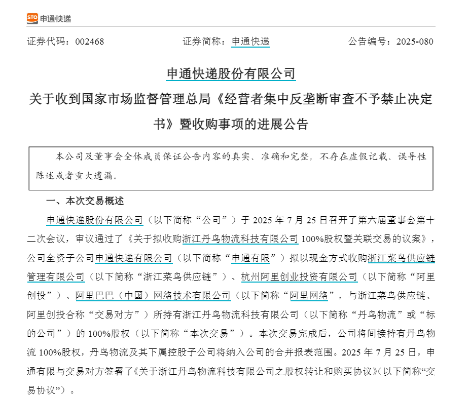 【大河财立方 记者 丁洋涛】申通快递收购丹鸟物流股权案进入实质性实施阶段。10月29日晚间,申通快递发布公告称,公司收到市场监管总局出具的《经营者集中反垄断审查不予禁止决定书》,显示对申通快递收购浙江丹鸟物流科技有限公司股权案不予禁止。