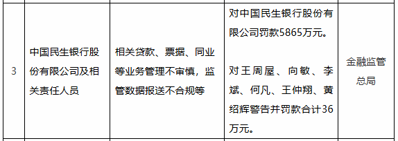 根据有关规定,金融监管总局对对中国民生银行股份有限公司罚款5865万元。对相关责任人王周屋、向敏、李斌、何凡、王仲翔、黄绍辉警告并罚款合计36万元。
