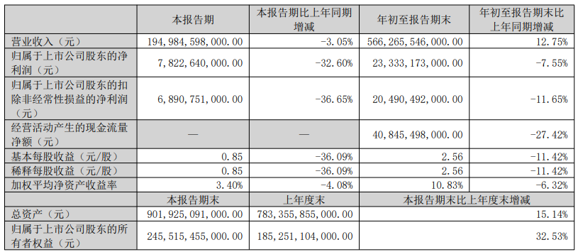 10月30日,比亚迪三季报显示,今年前三季度,比亚迪实现营收约5662.7亿元,同比增长12.75%,创同期历史新高;净利润约为233.33亿元,同比下降7.55%。不过,分季度来看,第三季度比亚迪实现营收1949.84亿元,同比下降3.05%;实现净利润78.23亿元,环比增长23%;毛利率环比上升1.6个百分点。