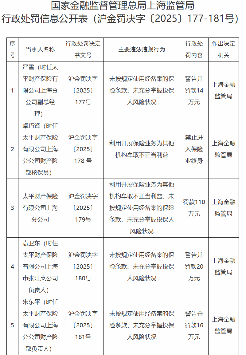 同时,上海金融监管局对时任太平财产保险有限公司上海分公司副总经理严雪警告并罚款14万元,时任太平财产保险有限公司上海分公司财产险部核保员卓巧锋禁止进入保险业终身,时任太平财产保险有限公司上海市张江支公司负责人袁卫东警告并罚款20万元,时任太平财产保险有限公司上海分公司财产险部负责人朱东平警告并罚款16万元。