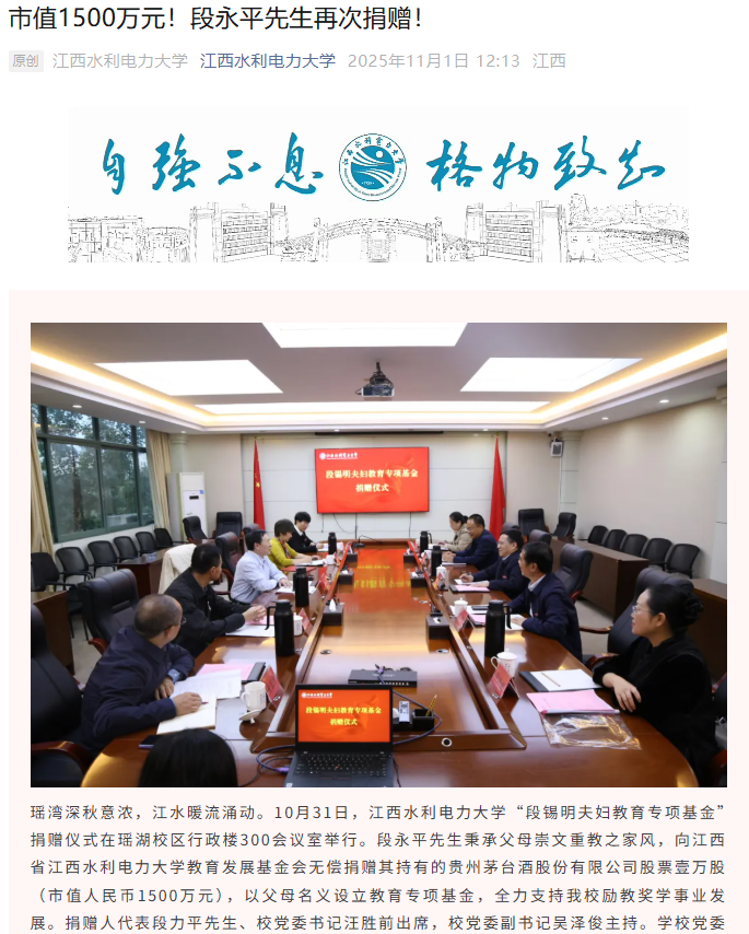 【大河财立方消息】据江西水利电力大学消息,10月31日,江西水利电力大学“段锡明夫妇教育专项基金”捐赠仪式在瑶湖校区行政楼300会议室举行。