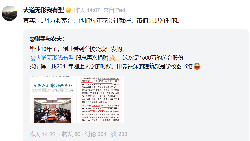 对此,段永平在其雪球账号“大道无形我有型”的主页上表示:“其实只是1万股茅台,他们每年花分红就好。市值只是暂时的。”