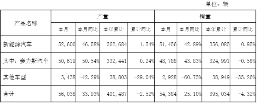 其中,赛力斯汽车产量5.06万辆,同比增长50.54%;销量4.88万辆,同比增长43.83%。其他车型产量和销量均出现下滑。