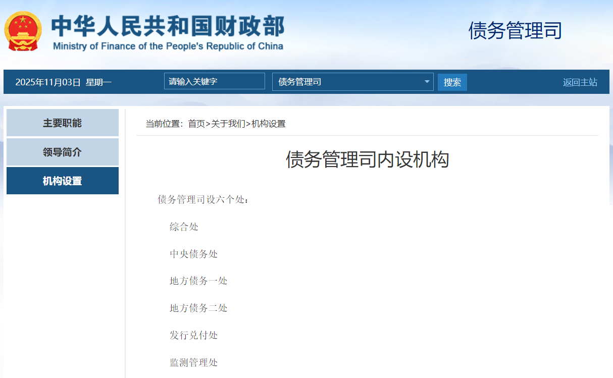 【大河财立方消息】11月3日消息,近日财政部官网“机构设置”栏目更新信息显示,财政部债务管理司已列入“部机关”列表。