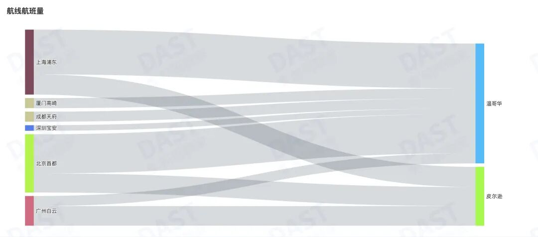 根据航班管家DAST统计,今年10月,中加航线往返航班量为319班次,同比增长超2.5倍,同比2019年下降64.4%。10月,通航航线9条,航班量TOP3航线分别为上海浦东-温哥华(80班次)、北京首都-温哥华(70班次)、上海浦东-皮尔逊(36班次)。