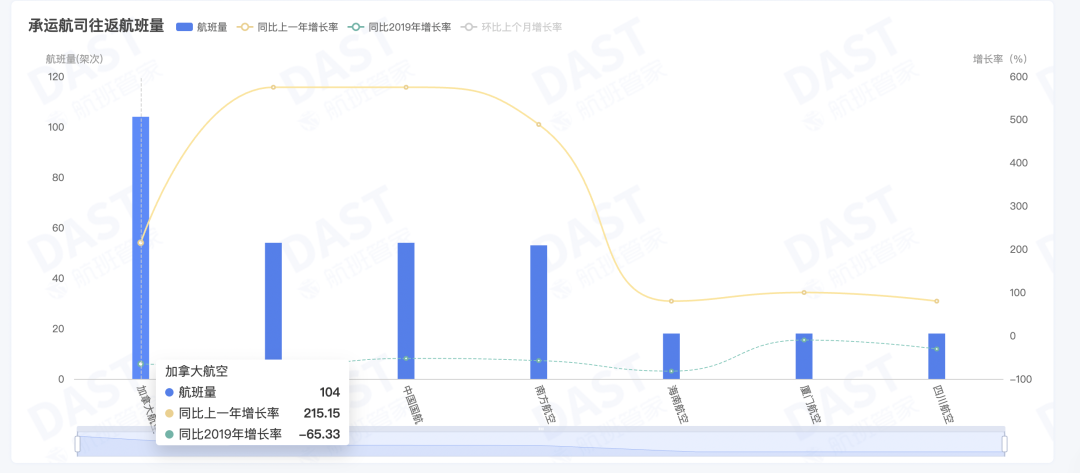 10月,加拿大航空执飞航班量104班次,居于承运航司首位,同比2024年增长超2.1倍,同比2019年下降65.3%。
