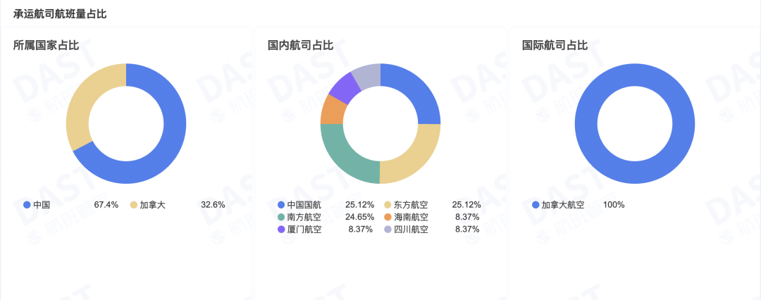 从承运航司来看,国内航司航班量占比67.4%,三大航航班量占比接近。