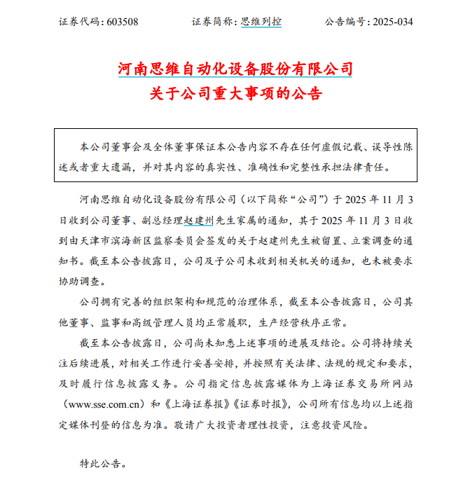 思维列控称,截至目前,公司及子公司未收到相关机关的通知,也未被要求协助调查。公司拥有完善的组织架构和规范的治理体系,公司其他董事、监事和高级管理人员均正常履职,生产经营秩序正常。