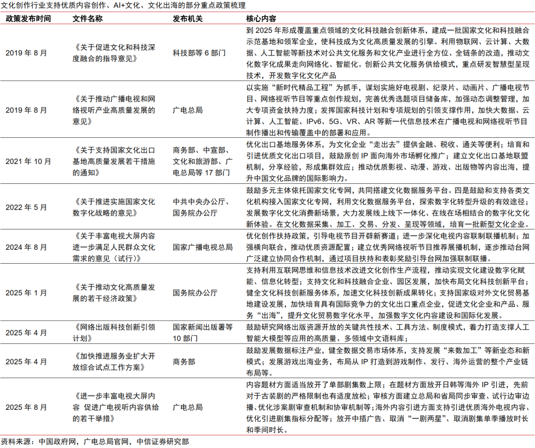 本次“十五五”规划建议稿从“AI+”应用以及支持文化产业发展两方面对内容创作领域进行支持。展望后续产业趋势,我们认为一方面AI赋能创意行业效率提升与新产品落地。AI创作工具有望深入影视、游戏等内容创作工作流,发挥降本增效作用。后续伴随AI功能的持续演进,AI直接驱动的文化产品如AI漫剧等有望直接实现商业化落地。另一方面,在消费者需求刺激和政策支持下,国产精品内容商业化空间快速提升,内容竞争力强化下文化出海和IP出海的竞争力也在快速提升。以《黑神话·悟空》、《哪吒2》为代表的优质内容广受市场欢迎的同时,也打开了所属市场的市场空间,“广电21条”以及游戏行业相关支持政策也推动影视、游戏等文化市场的繁荣。在市场景气度提升下,国产优质内容在海外竞争力也得到逐步强化,以Labubu为代表的国产IP出海、以短剧为代表的国产内容形态出海市场空间快速扩张,打开国内文化产品的新增长曲线。建议重视AI与文化创意赛道相结合带来的AI新应用,以及精品内容产品后续的商业化价值。