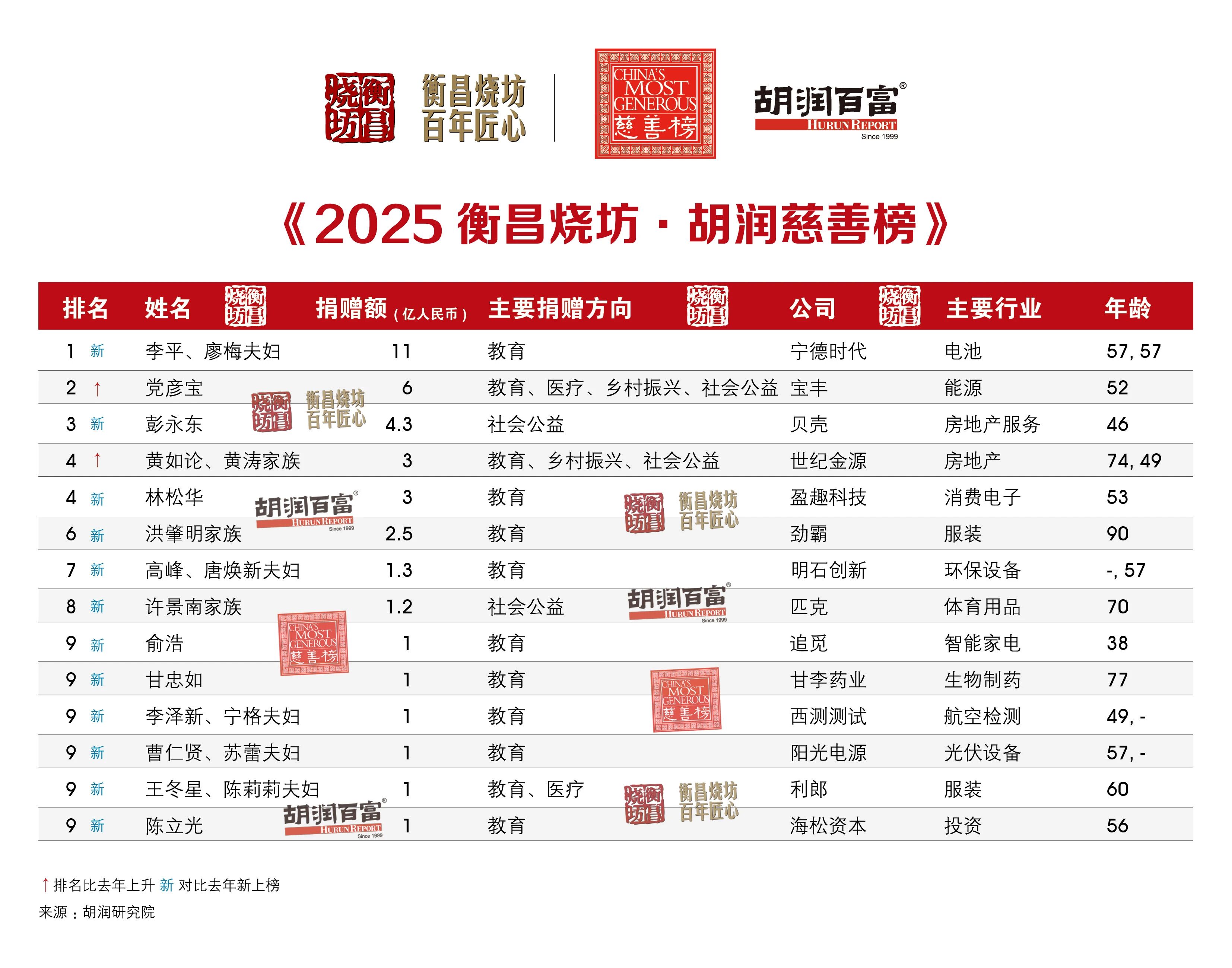 【大河财立方消息】11月4日,胡润研究院发布《2025衡昌烧坊·胡润慈善榜》,宁德时代联合创始人、57岁的李平及其夫人廖梅,向上海复旦大学教育发展基金会捐赠股票,折合人民币11亿元,首次登上胡润慈善榜便成为中国首善。