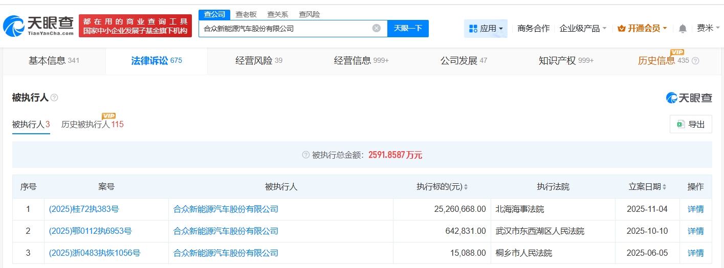 【大河财立方消息】天眼查法律诉讼信息显示,11月4日,哪吒汽车关联公司合众新能源汽车股份有限公司新增一则被执行人信息,执行标的2526万余元,执行法院为北海海事法院。
