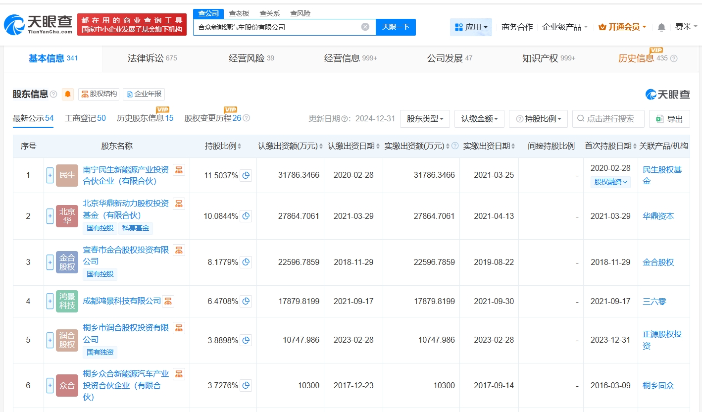 合众新能源汽车股份有限公司成立于2014年10月,法定代表人为方运舟,注册资本约28.37亿人民币,经营范围包括新能源汽车整车及零部件的设计开发、生产、销售及相关的咨询服务等。股东信息显示,该公司由南宁民生新能源产业投资合伙企业(有限合伙)、北京华鼎新动力股权投资基金(有限合伙)、宜春市金合股权投资有限公司等共同持股。天眼风险信息显示,该公司现存3条被执行人信息,被执行总金额超2591万余元。此外,该公司还存在多条限制消费令、股权冻结信息。