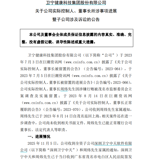 本次案件源于2023年。当年7月5日,卫宁健康公告,周炜因涉嫌行贿,被茂名市监察委员会立案调查及实施留置; 同年8月14日,周炜解除留置,自茂名返回上海,相关案件还在进一步调查中。