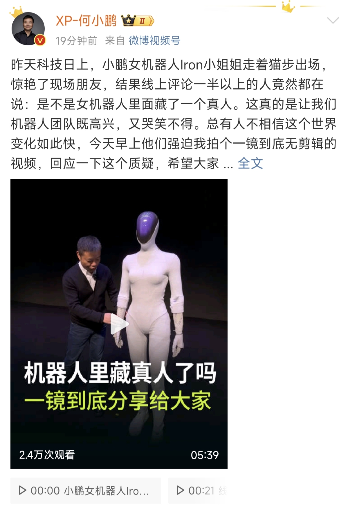 【大河财立方 记者 王宁宁】11月6日,小鹏汽车董事长何小鹏在微博发布视频回应网友的质疑。在小鹏科技日上,小鹏研发的女人形机器人IRON走着猫步登台,有网友称“感觉是个真人在扮演机器人”。