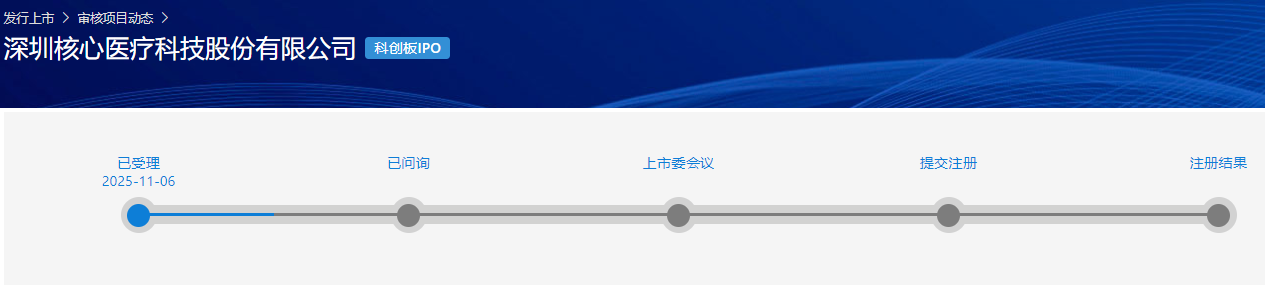 【大河财立方消息】11月6日,深圳核心医疗科技股份有限公司(以下简称:核心医疗)科创板IPO申请获上交所受理,成为科创板第五套上市标准重启后,首家成功受理的创新医疗器械企业。
